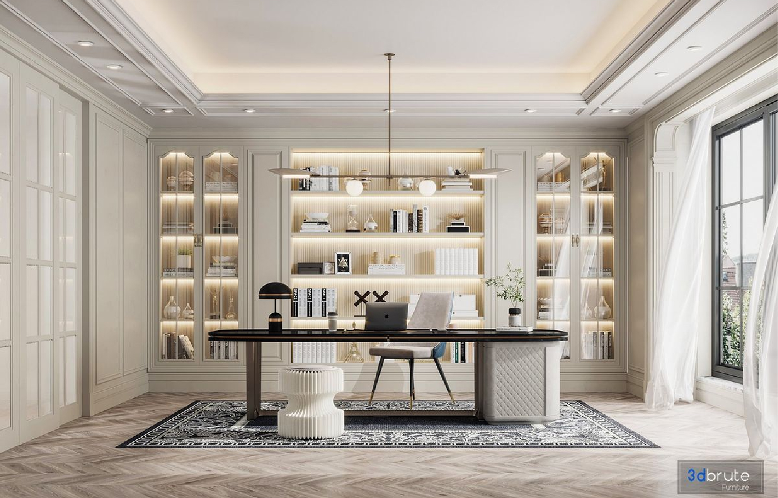 Menggunakan warna-warna elegan, panel kayu, dan furnitur berkelas. Cocok untuk kantor hukum, keuangan, atau perusahaan yang ingin menonjolkan kredibilitas.